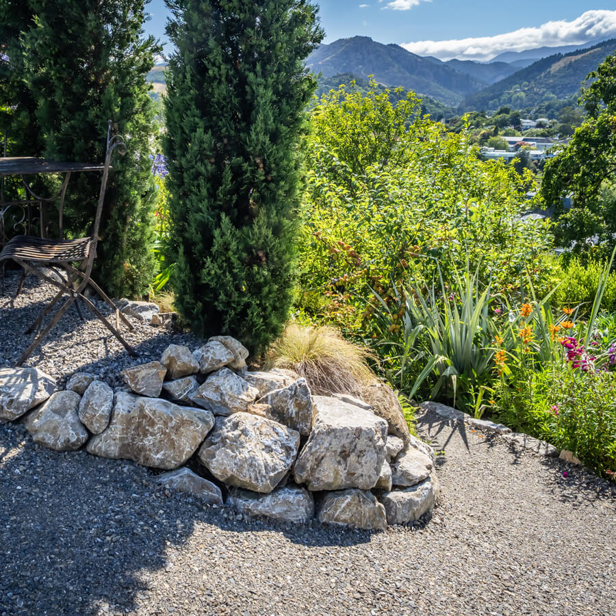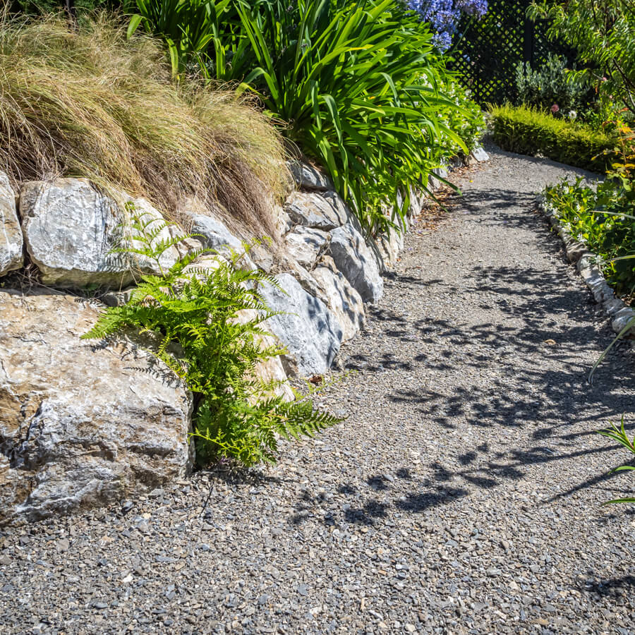A picturesque garden pathway and rock wall, using Wakefield Quarry rock and gravel.